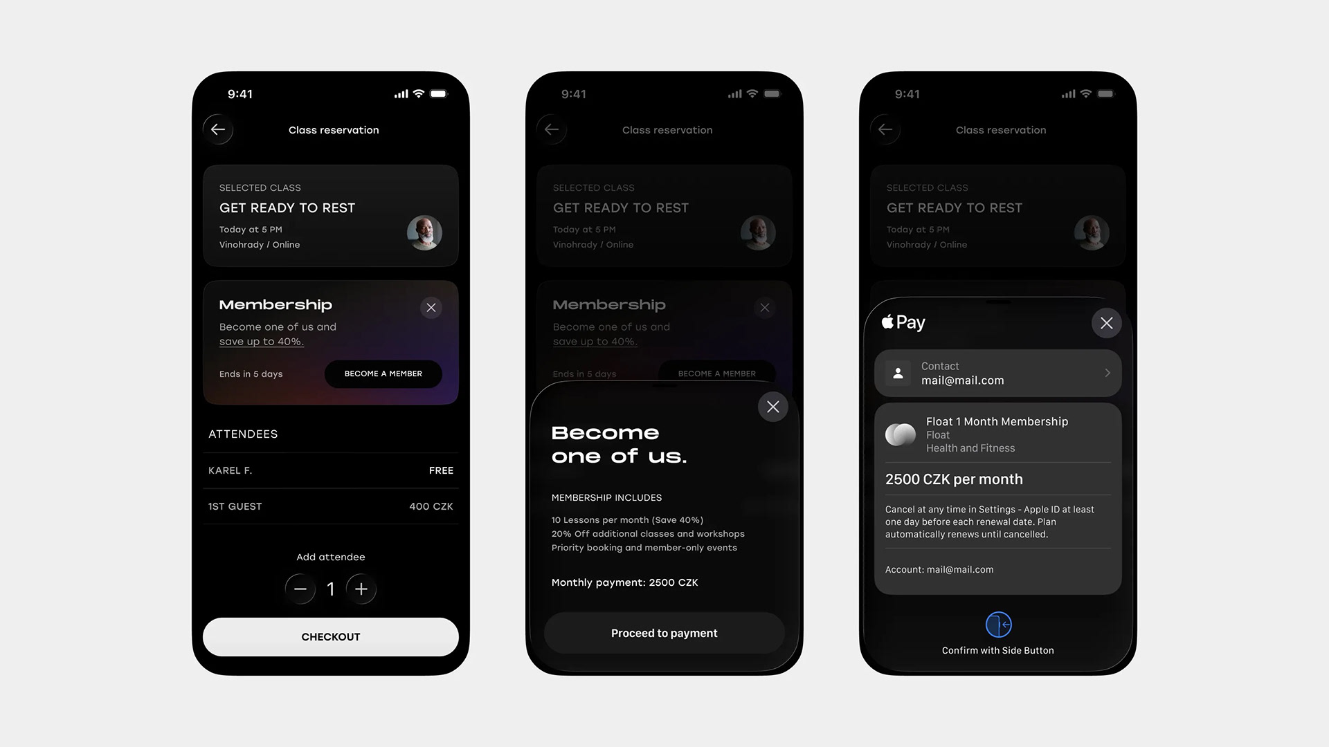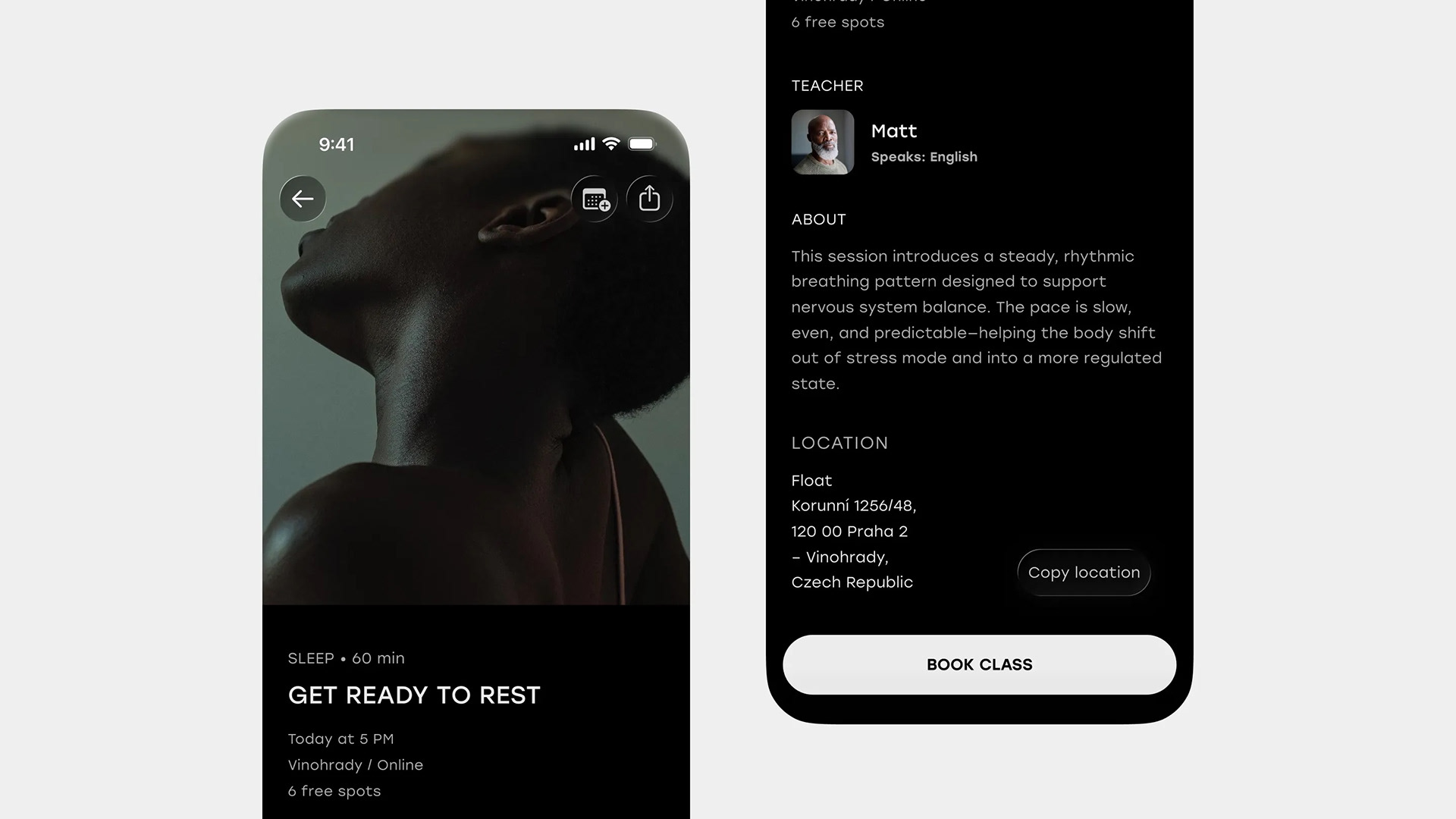 A concept exploration rethinking Float's brand identity and class booking flow. Starting with a breakdown of the existing visual language and moodboarding a new direction, the project culminates in a high-fidelity design incorporating the latest iOS 26 Liquid Glass components. Following are result presentation shots
