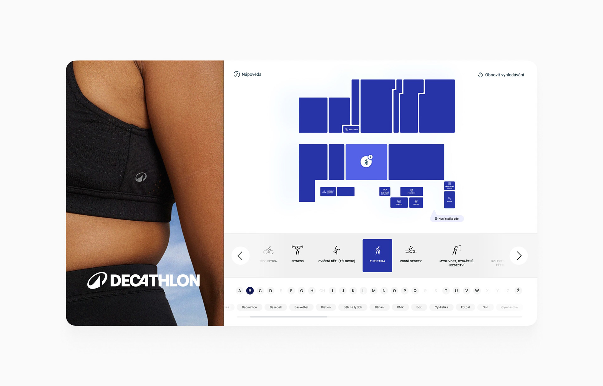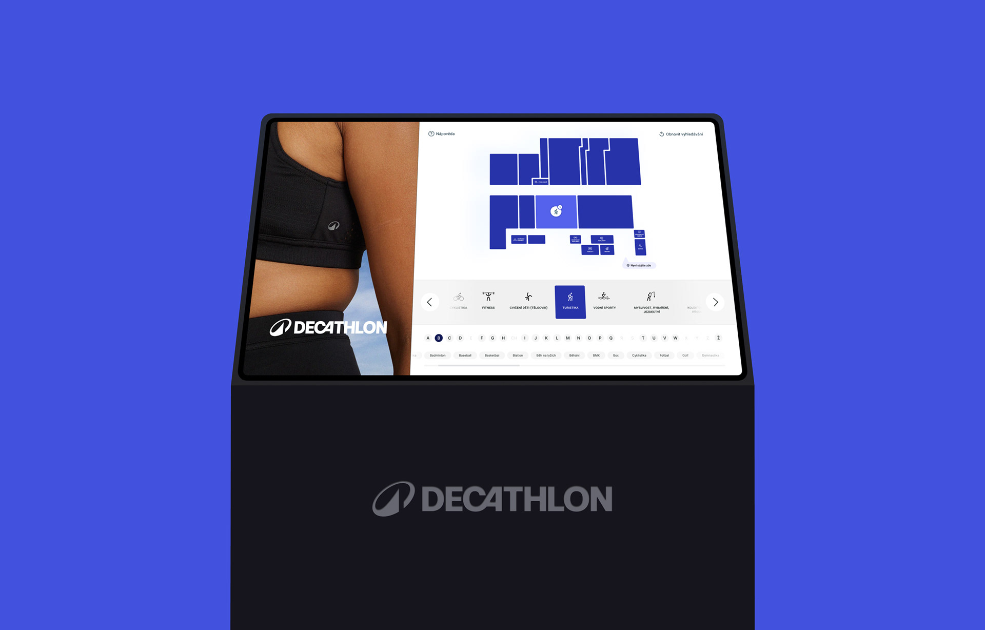 This navigation system offers a sleek solution for helping customers find product sections in Decathlon stores. In collaboration with POS Digital s.r.o., the kiosk hardware provider, I designed the complete user experience for this innovative in-store kiosk.