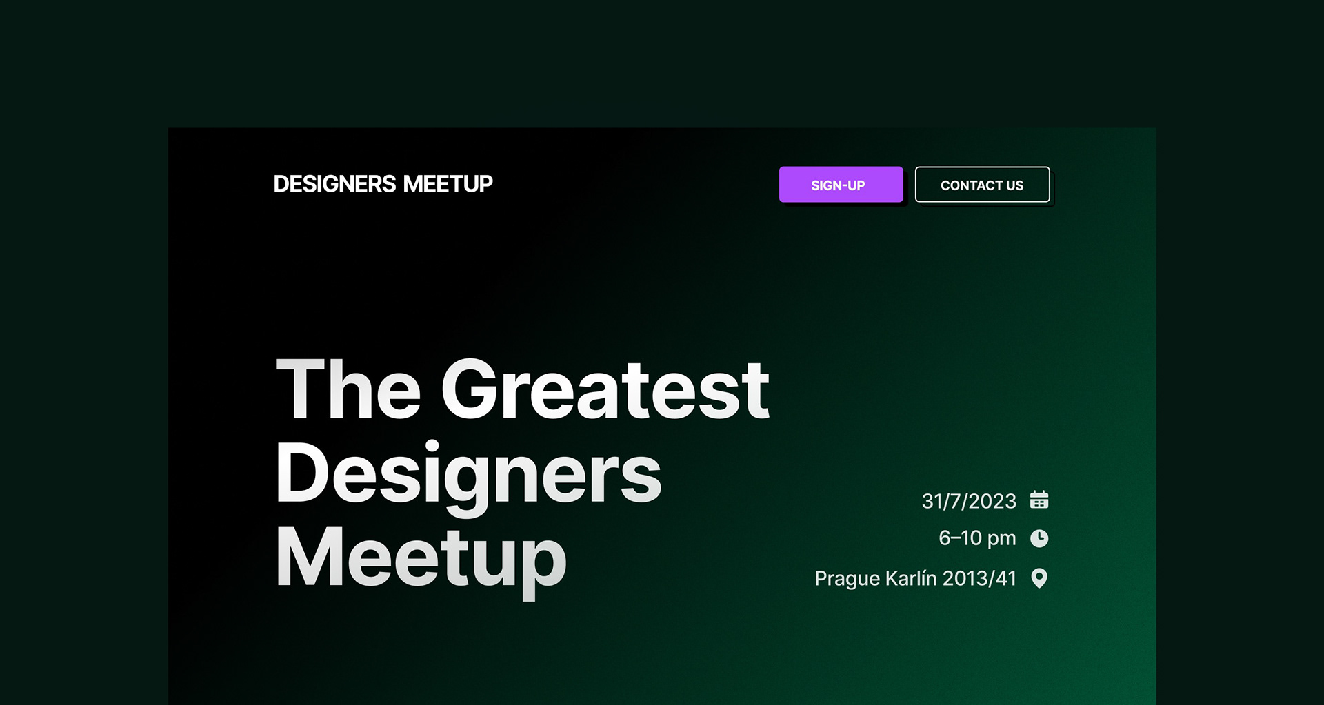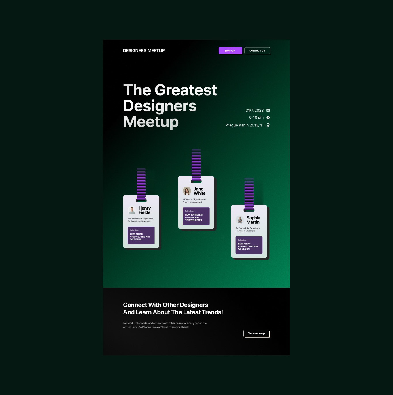This landing page concept was designed for a designers’ meetup in Prague, blending mystical tones with rich, grainy gradients to create a distinctive visual identity.