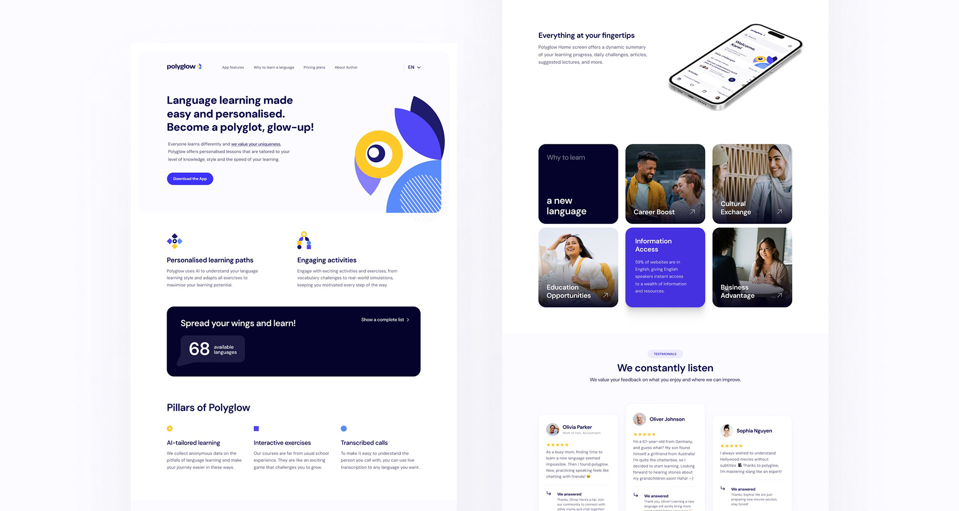 This full brand identity, landing page, and mobile app design for Polyglow was created from scratch in under 72 hours. Inspired by a love for learning, I designed everything with the goal of making learning feel fresh and fun. Meet Henry the parrot, the cheerful mascot who oversees your progress and helps you glow as a polyglot!